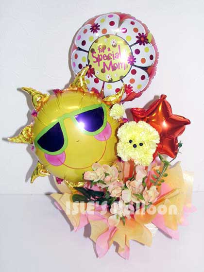 登録No ib051005 太陽のように元気カラーのオレンジ色を使いました。 メッセージフォイルバルーンと、カーネーションドッグのシルクフラワーで母の日チックに!