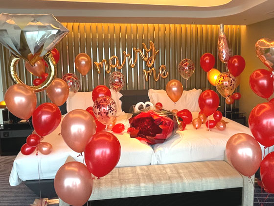 「marry me 」のレターバルーンを使ったプロポーズ装飾。