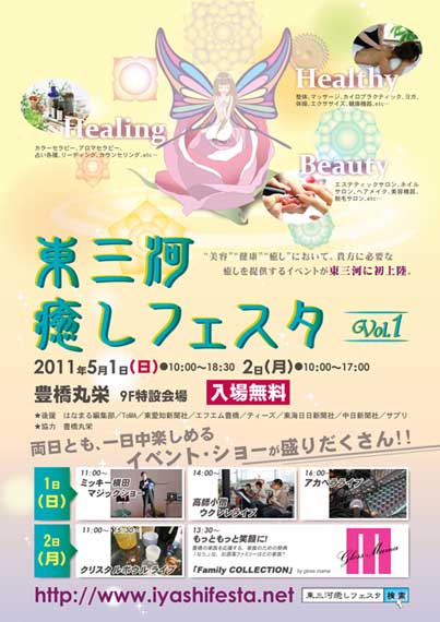 東三河初、癒しのイベント開催。 いろいろな「癒し」を体験ください! 日時 : 2011年5月1日(日)10:00~18:30 5月2日(月)10:00~17:00 場所 : 豊橋丸栄9F催事場 入場料:無料 ゴールデンウ …