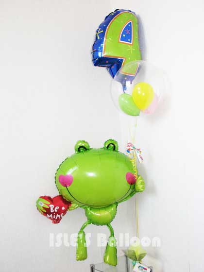登録No ib050129 アイルズバルーン一番人気のかえるちゃんを使ったブーケです。差し上げる方のお歳をナンバーバルーンで表現してはいかがですか。