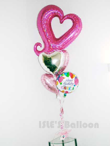 ピンクできらきらのオープンハートと,やさしいピンク系のハート型フォイルバルーンでまとめました。