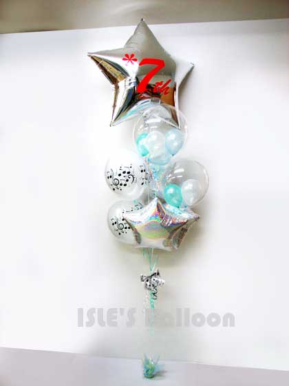 音符のラテックスバルーンや、パールのブルー・グリーン系の爽やかな色合いのインサイダーバルーンなどで、爽やかな印象のブーケになりました。