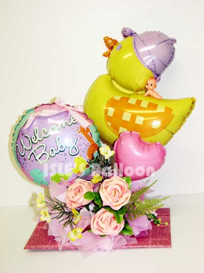 登録No ib090506 人気のQPちゃんがダックの上に乗っかってます! ピンク系なので、女の子をご出産されたお祝いにどうぞ。