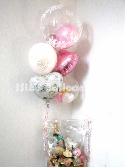 シャンパンボトルやグラス、ゴールドリボンでゴージャス感を出したアレンジメントに、パールピンクやモーブのやさしいカラーのゴム風船が入ったインサイダーバルーンなどをお付けし、ボリュームのあるギフトになりました。