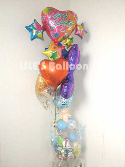 登録No ib090614 トップにキューピーちゃんがついたバルーンラッピングに、派手派手なバースデークラスターフォールバルーンや音符バルーン、スターやハートのフォイルバルーンがついています。