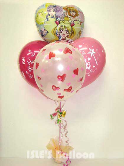 プリキュアのフォイルバルーンにピンク系のプリントラテックスバルーンをあわせました。