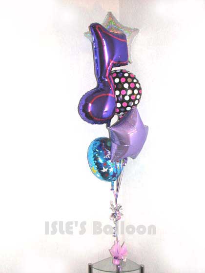 登録No ib090834 シックな音符バルーンをトップに、同じくシックなドットやスターバルーンを配置しました。コングラッツシューティングスターのメッセージを添えて・・・