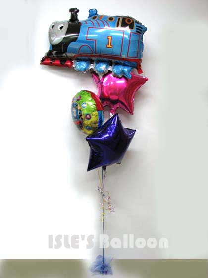 機関車トーマスの大きいフォイルバルーンに、ビビッドカラーのスターフォイルバルーンとトーマスプリントのフォイルバルーンを合わせました。