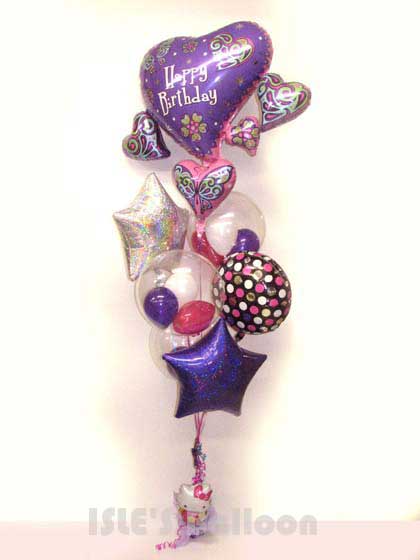 一番上のバースデーバルーンは、大変人気商品でしたがとうとう廃盤になってしまいました。このバルーンに合わせて、紫・ピンクを効かせたインサイダーバルーン、スターもダズラーでキラキラです。