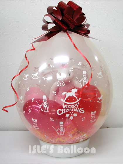 レッドメタリックのボウに、『メリークリスマス』のメッセージとおもちゃがプリントされた大きなバルーンにラッピング。
