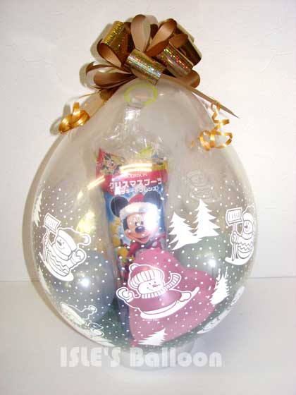 登録No ib091004 お客さまのお持ちになったクリスマスブーツに入ったお菓子を、バルーンラッピング致しました。
