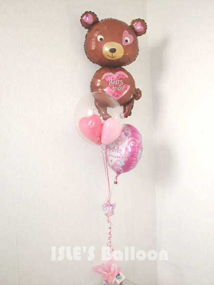 バレンタイン用に発売されたラブベアですが、関係なく人気です。女の子用のお誕生日メッセージフォイルバルーンを添えて。