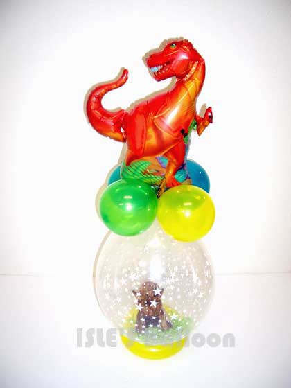 登録No ib050107 恐竜のフォイルバルーンをバルーンラッピングのトップに付けました。ラッピングのバルーンは中ぐらいのサイズで25cm。5cm以内の小さなプレゼントでしたら入れることができます。