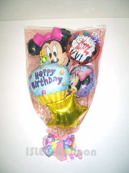 ミニーちゃんのバルーンをダブルで使い、ケーキ型のバースデーメッセージバルーンを入れ込みました。
