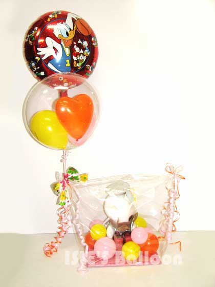 ドナルドのぬいぐるみの周りにゴム風船をおき、クリアなパッケージでラッピング致しました。
