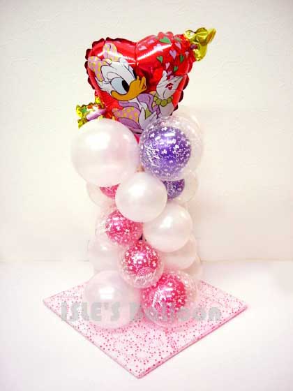 登録No ib050309 デイジーのフォイルバルーンをトップに、プチコラムを組みました。大きさ約50センチ。パープル&ピンクは、プリント柄のダイアモンドクリアとダブルバルーンとなっています。
