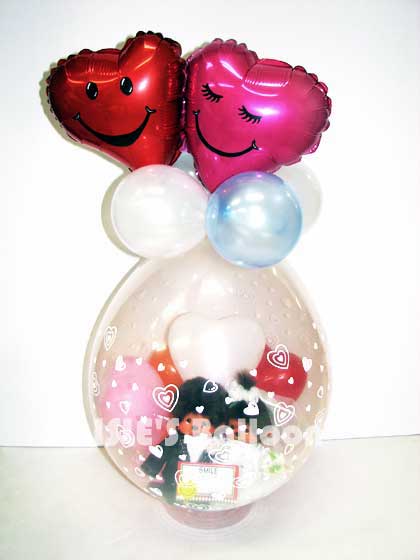 登録No ib050311 お持ち頂いたモンチッチをラッピング致しました。トップのフォイルバルーンはラブラブのダブルハート。ボリュームある仕上がりになりました。