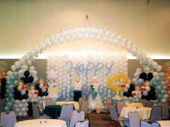 登録No ci050109 「Happy Wedding」のバルーンウォールを中心に、 レセプションホールを華やかに装飾。 この商品に関するお問い合わせはこちらから (登録Noを添えて下さい)