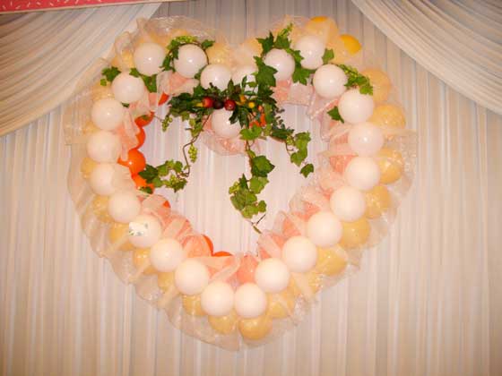 登録No ci050311 バルーンは秋色のゴールデンロッドとオレンジ・ホワイトで、秋に採れるフルーツとぶどうのブッシュで飾りました。 この商品に関するお問い合わせはこちらから (登録Noを添えて下さい)